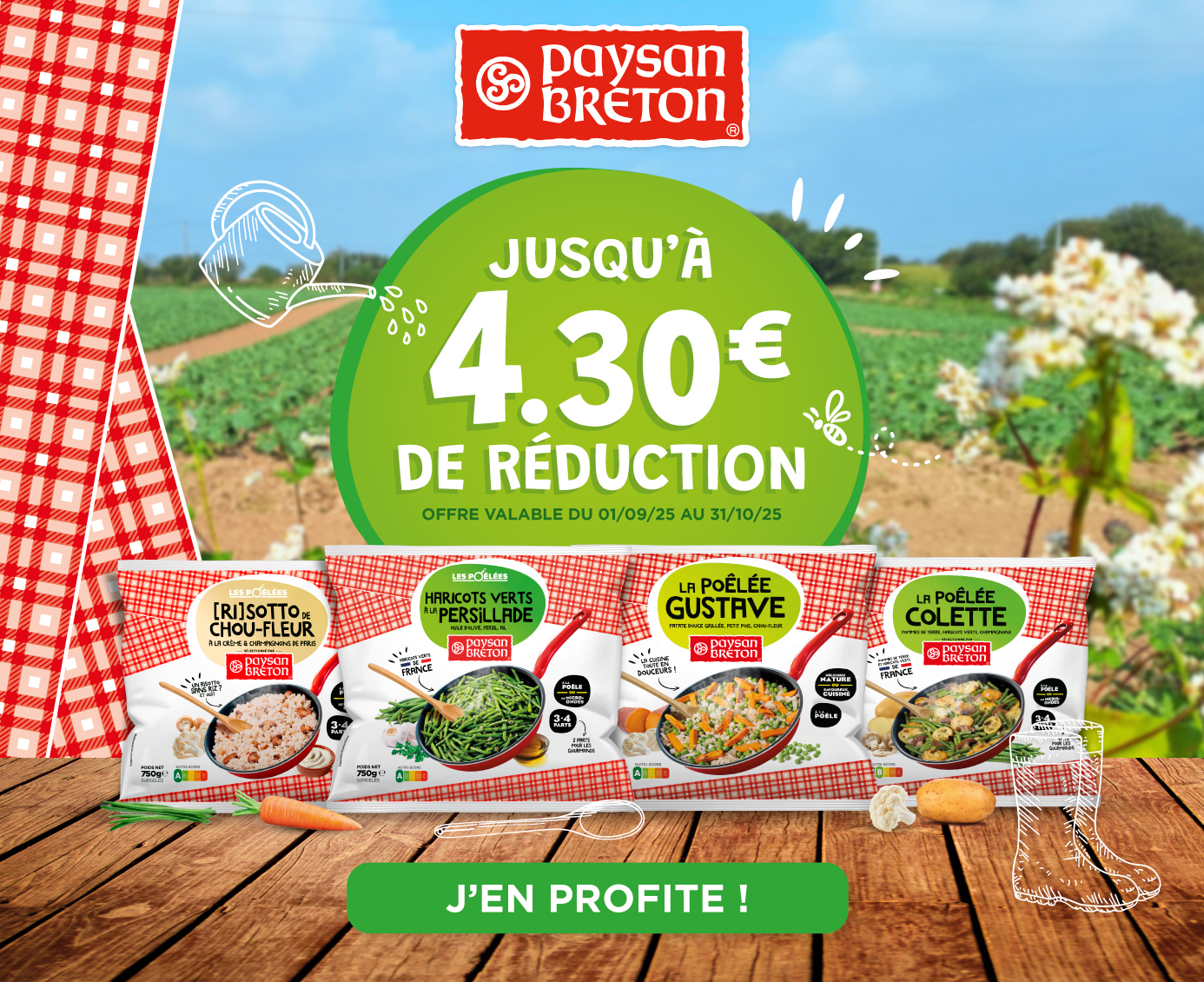 Profitez d'offres exclusives sur nos légumes et poêlées surgelées avec les bons de réduction Paysan Breton ! Téléchargez vos bons de réduction dès maintenant en cliquant sur le visuel ci-dessous et régalez toute la famille à prix doux.